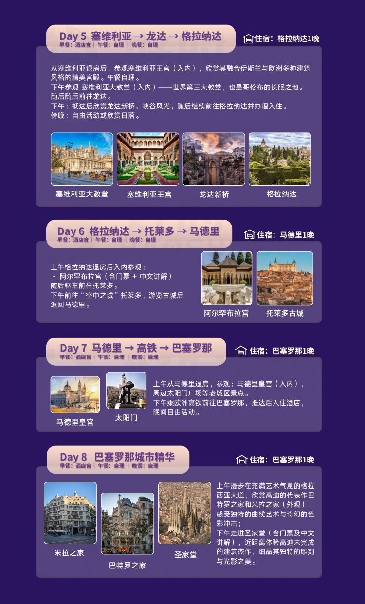 行程涵盖马德里、托莱多、格拉纳达、龙达、塞维利亚、巴塞罗那。