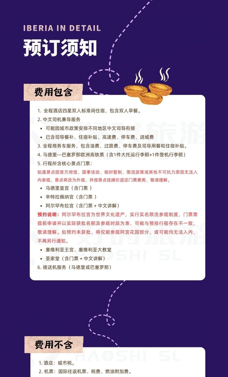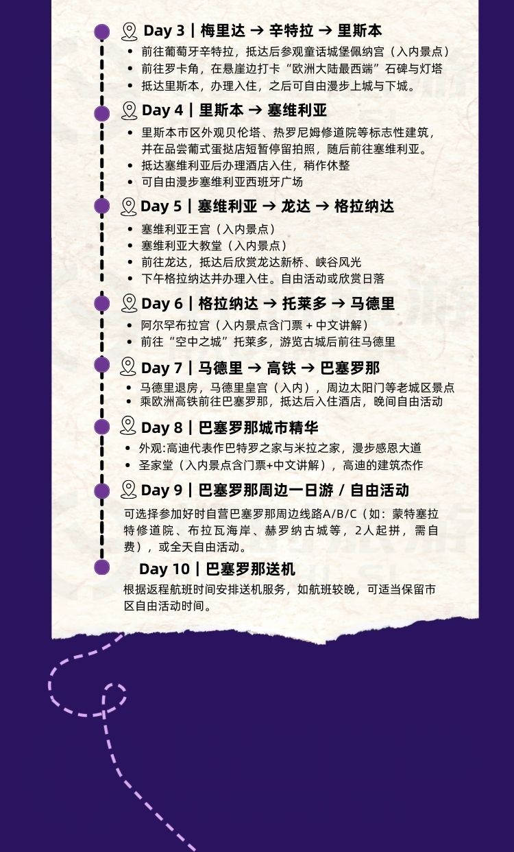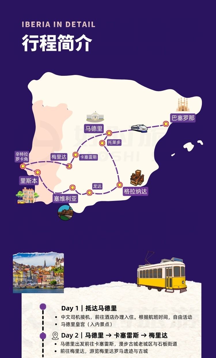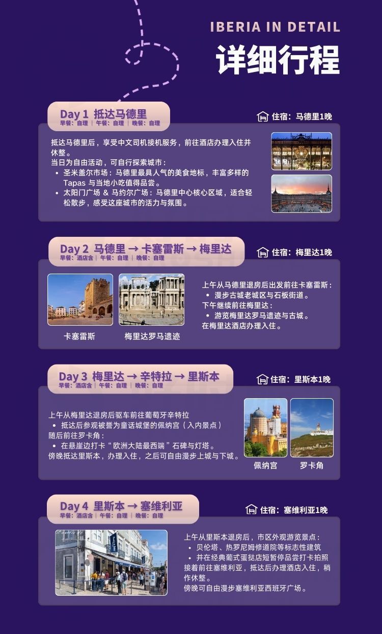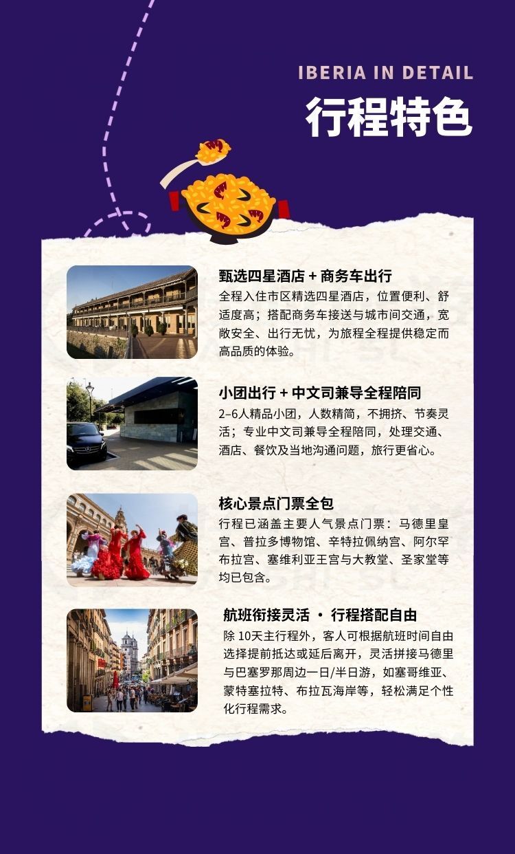 轻松深度畅游伊比利亚:皇宫、普拉多、阿尔罕布拉宫、塞维利亚王宫&大教堂、托莱多、辛特拉、佩纳宫、罗卡角、圣家堂等热门景点全部预约入内。全程商务车+中文司导,马德里—里斯本—巴塞罗那高效衔接,节奏舒适不赶场;入住市区四星酒店,全程无购物无自费,让旅程更轻松、更纯粹。